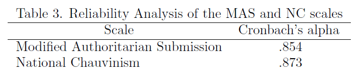 In the third stage, participants were subjected to two batteries of questions, corresponding to two scales: the Modified Authoritarian Submission (MAS) scale, and the National Chauvinism (NC) scale. Both scales may also be found in the codebook, at Appendix 1.
