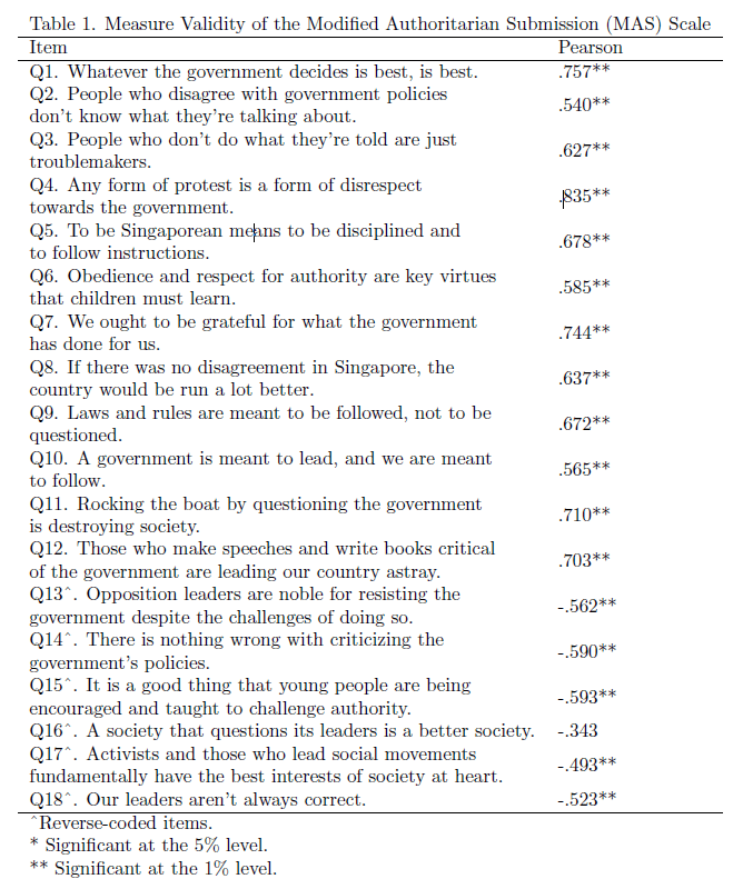 Both the MAS and NC scales were designed with reference to existing literature on authoritarianism and nationalism. The MAS scale is intended to understand the effectiveness of the national education curriculum in Singapore; in other words, how effectively consent had been conditioned in participants (Brighouse, 2003). To this extent, the “Conservatism” dimension of Altemeyer’s (1981) RWA scale, which measures “attitudes favoring uncritical, respectful, obedient support for existing societal authorities and institutions versus critical, questioning, rebellious, oppositional attitudes to them.” (Duckitt & Bizumic 2013, p. 843), was adapted and localized. Altemeyer (2008) presents the most updated version of his scale. The questions are on a Likert scale from -4 (very strongly disagree), to 0 (neutral), to +4 (very strongly agree). The questions are as follows: